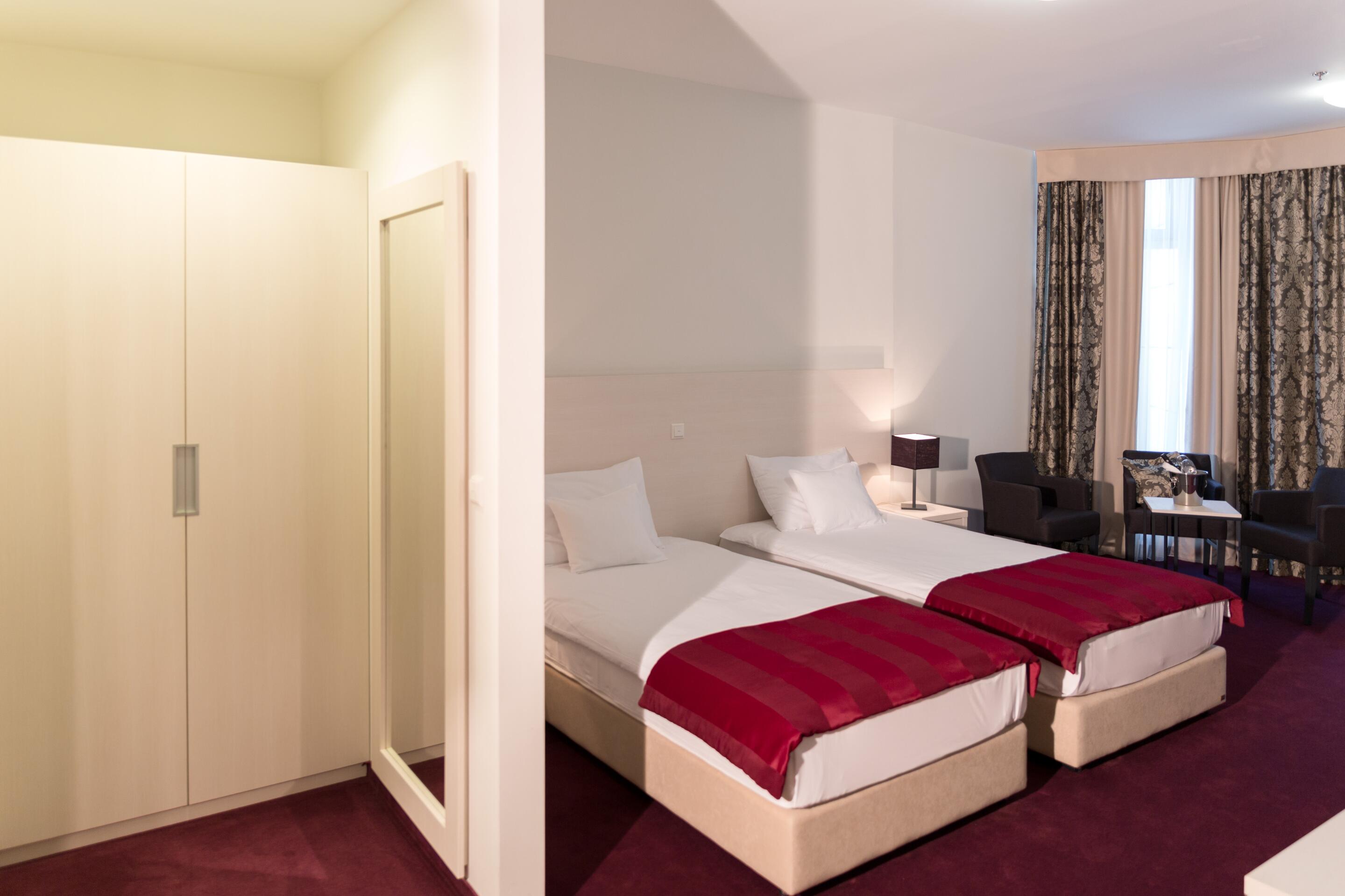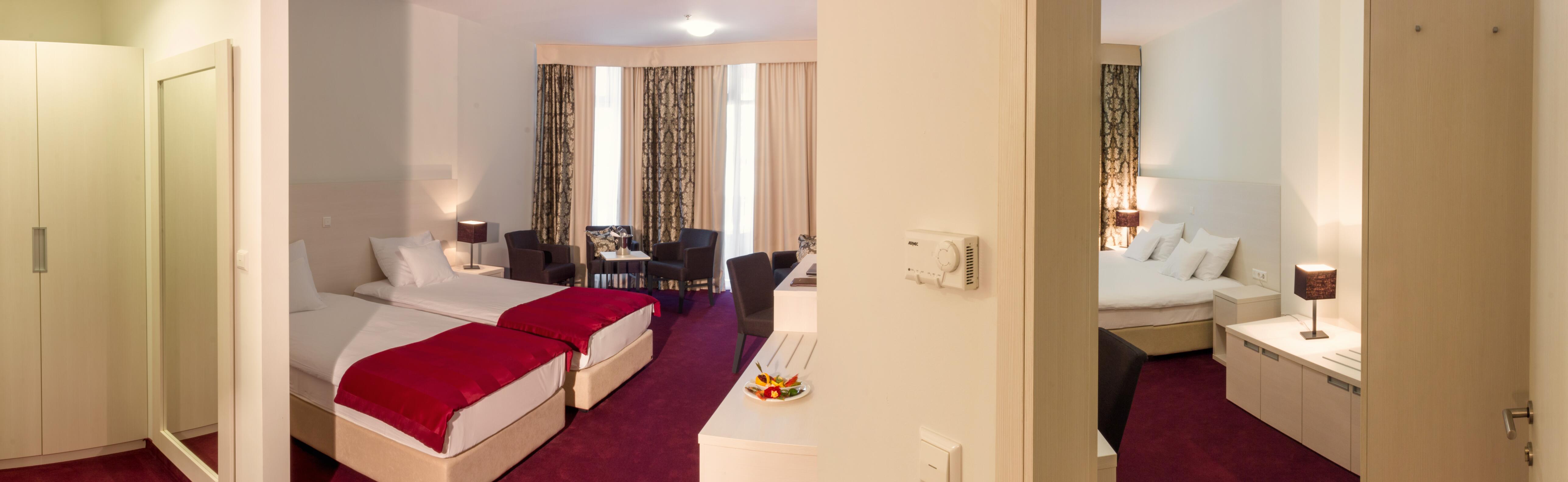 The family rooms are fully adapted to the rest of families with children. Two separate bedrooms offer the feeling of home, and their superb amenities include two LCD TVs, two telephones, two work desks, two mini bars, two electronic safes and a separate bathroom. As your and your children’s comfort is our priority, these rooms are characterized by a pleasant ambience, warm colours and spaciousness. If your family has more than four members, it is possible to bring an extra bed in the room.